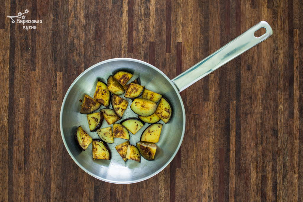 Параллельно с варкой дала, обжариваем на масле кусочки баклажана до золотистого цвета. Вынимаем, помещаем на салфетку, чтобы масло стекло.