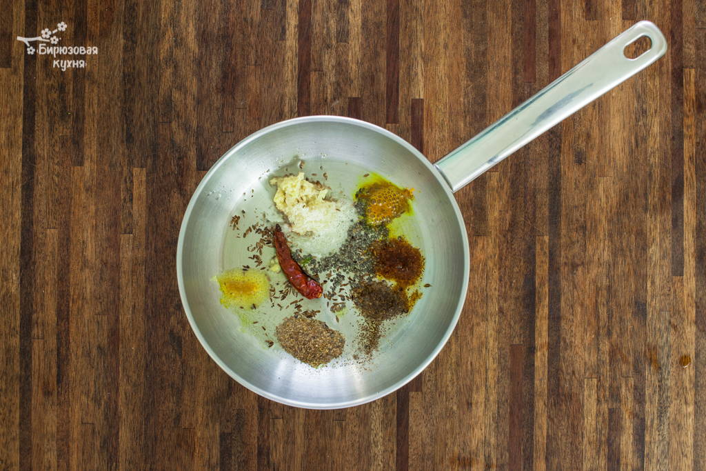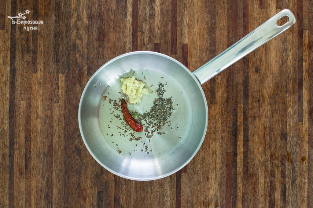 Переходим к зажарке. Нагреваем масло, обжариваем чили перец, семена горчицы, кумин до потрескивания, добавляем имбирную пасту