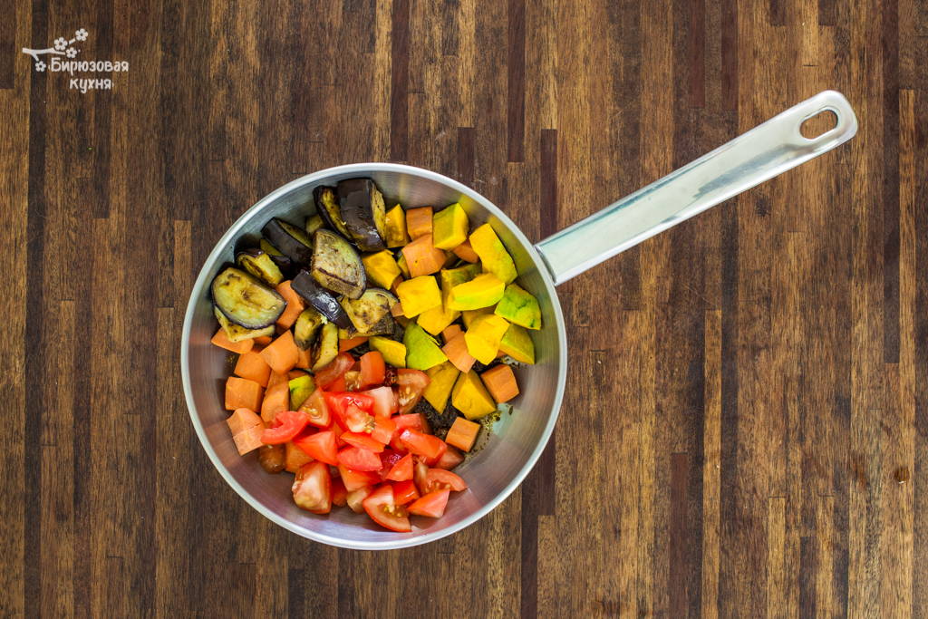 Далее добалвяем помидоры, и все овощи, которые вы решили использовать. Предварительно их нужно нарезать на кубики. В моем случае из овощей были: тыква, мороковь, помидоры, жаренные баклажаны.
