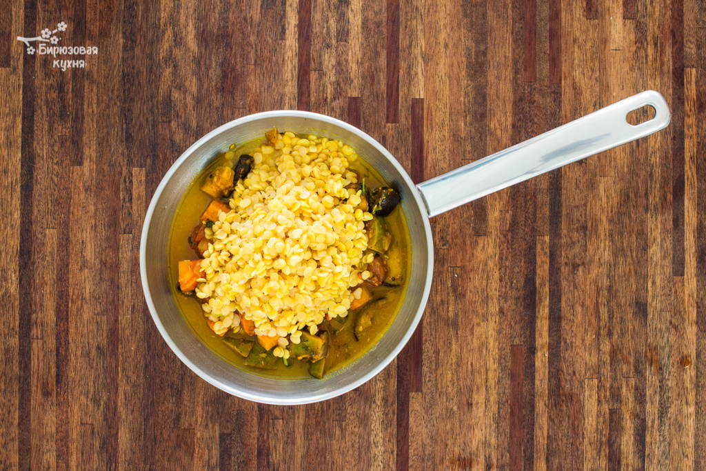 Добавляем дал и варим под крышкой на среднем огне до готовности овощей. Я проверяла по мягкости тыквы и моркови.