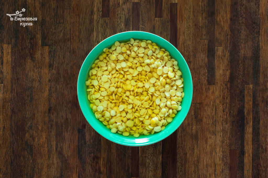 Замачиваем тур-дал на пару часов, так он быстро лучше усвоится организмом и быстрее сварится. Варим до 80 % готовности (до появления тоненьких ворсинок вокруг овала горошин). Это займет примерно 20-35 минут на среднем огне.